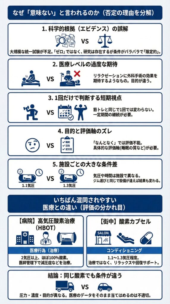 医療の研究結果をそのまま街の酸素カプセルに当てはめるのは、大型トラックの燃費データを軽自動車に使うようなものです。