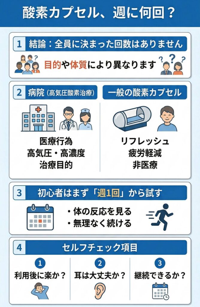 - 酸素カプセルの頻度は、「多いほどいい」ではなく、「目的に対してちょうどいいか」で考える