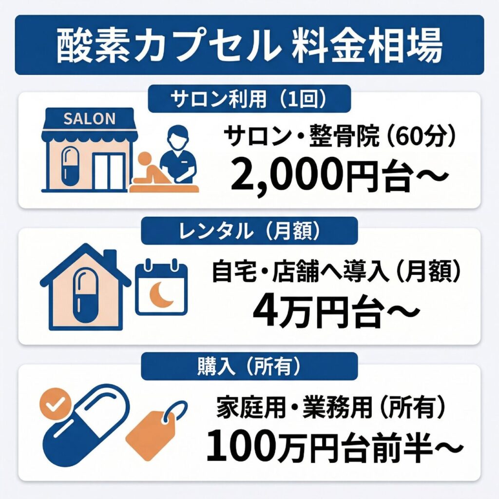 つまり、「酸素カプセルの料金相場」といっても、どの使い方を前提にするかで金額は大きく変わります。ここを分けずに考えると、相場を勘違いしやすくなります。
