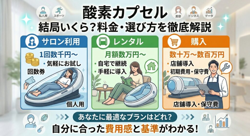 そこでこの記事では、酸素カプセルの料金相場を「サロン利用」「レンタル」「購入」に分けてわかりやすく整理し、それぞれどんな人に向いているのかまで解説します。後半では、個人利用だけでなく、整骨院や整体院、サロン、ジムなどで店舗導入を考えている方向けに、価格だけで判断しないための選び方も紹介します。